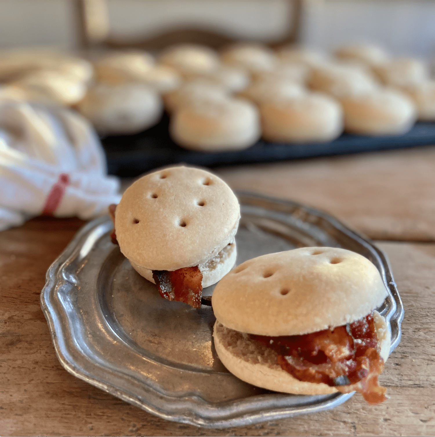 Because there are no leavening agents in them, they don’t rise much but will swell up enough to then split and serve country ham pieces or bacon on them. They are best enjoyed fresh from the oven but will last up to 3 weeks when stored in an air-tight container.