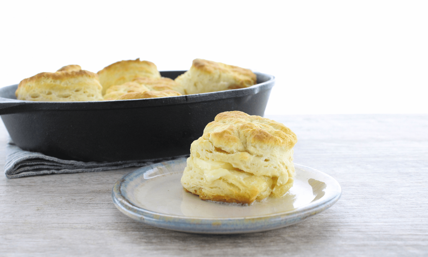 The key to making flaky biscuits is to use very cold butter and a very hot oven. We love baking them in cast iron skillets. They come out light and fluffy on the inside with a nice crispy top and bottom. And of course, they're delicious!