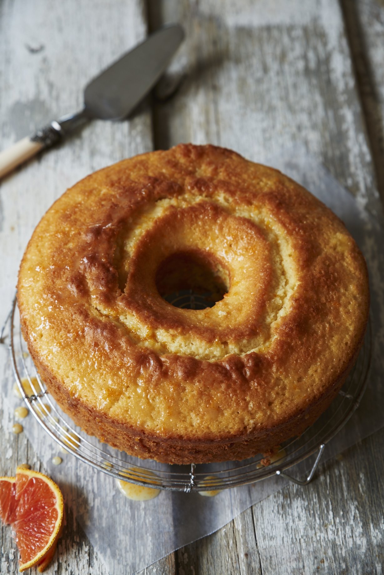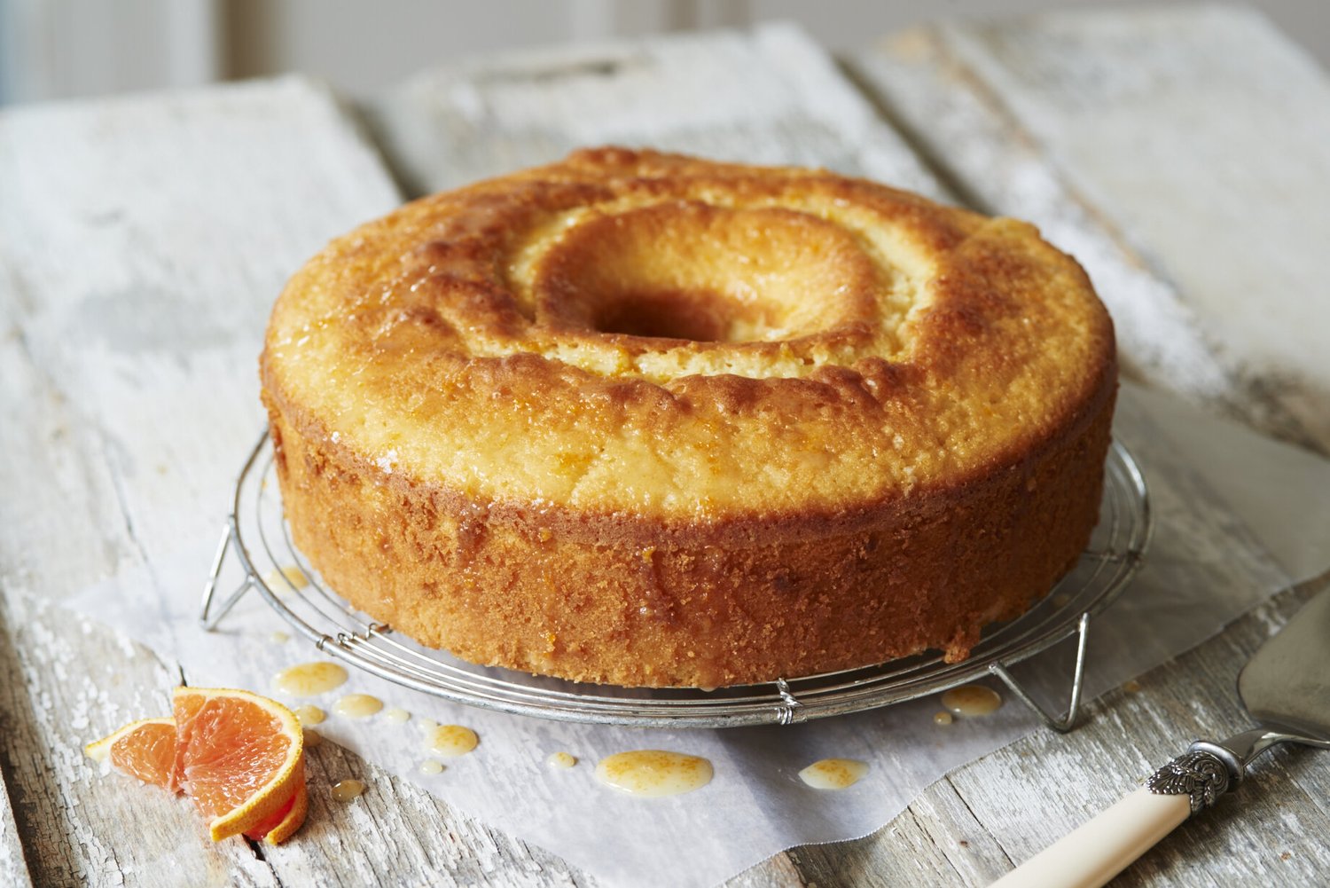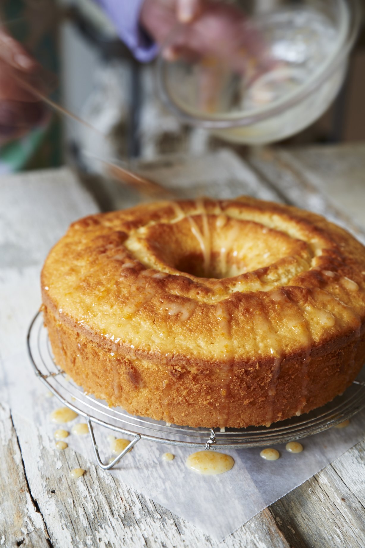 - Run a knife around the edges of the cake pan. Give the pan a good shake to loosen it, then invert it once and then again so that it rests right-side up on the rack. Poke holes in the top of the cake with a long wooden skewer or chopstick. Carefully spoon the glaze over the top of the cake, letting it soak into the cake before adding more. Let the cake rest 1 hour, then slice and serve.