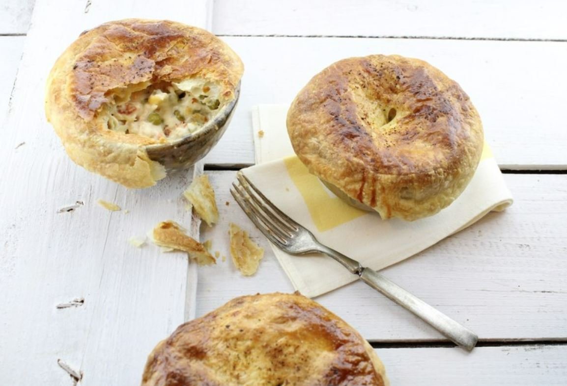 Make this family recipe style by adding ingredients into a deep-dish pie plate. You will only need one puff pastry sheet to drape over the top of the pie. Baking instructions are the same as the individual pies.