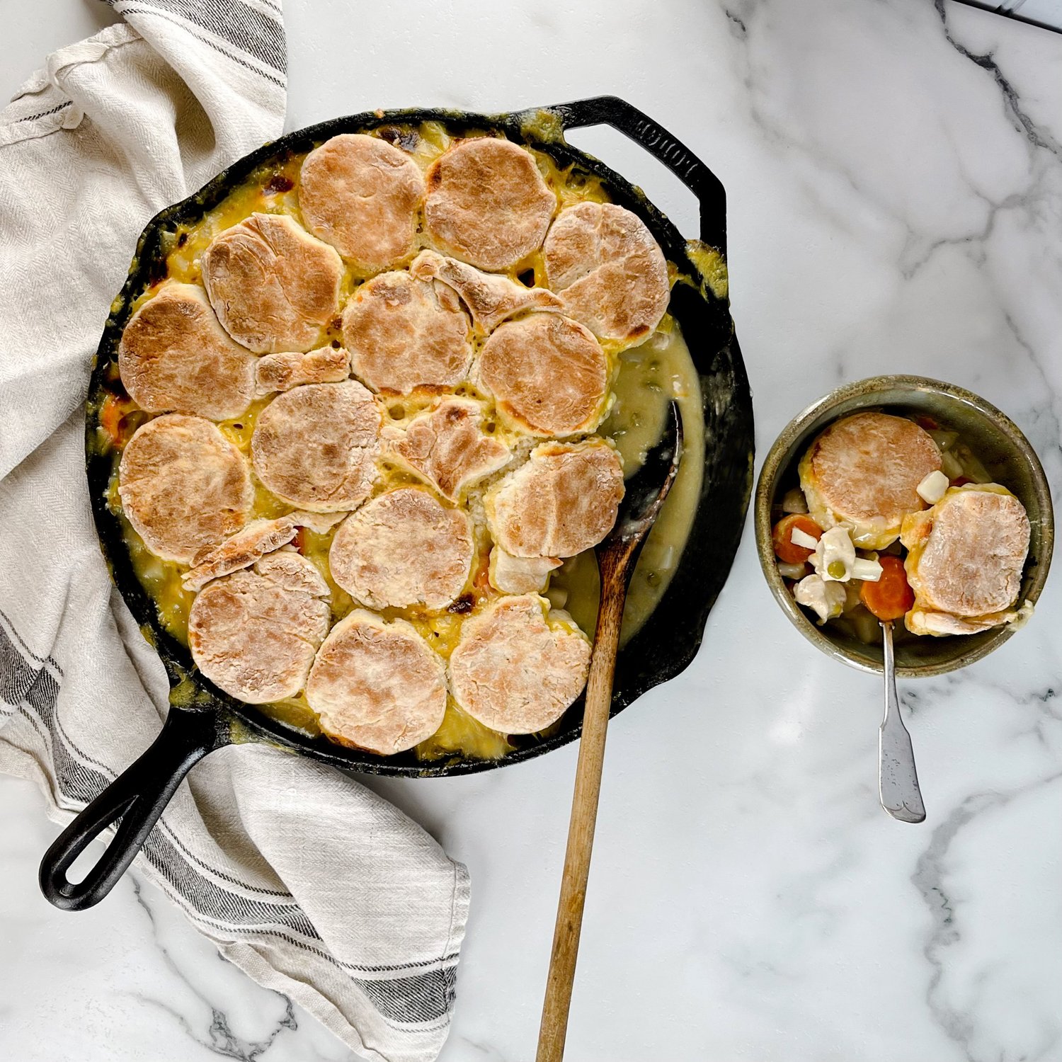 The best comfort food is a true southern dish, and this pot pie recipe will make you feel right at home. The buttermilk biscuits are made with our Miller's Choice Self-Rising Flour, submitted by Jeanne Vaughn in our 2020 recipe contest; we've adjusted them just enough to make one-pot cooking easier!