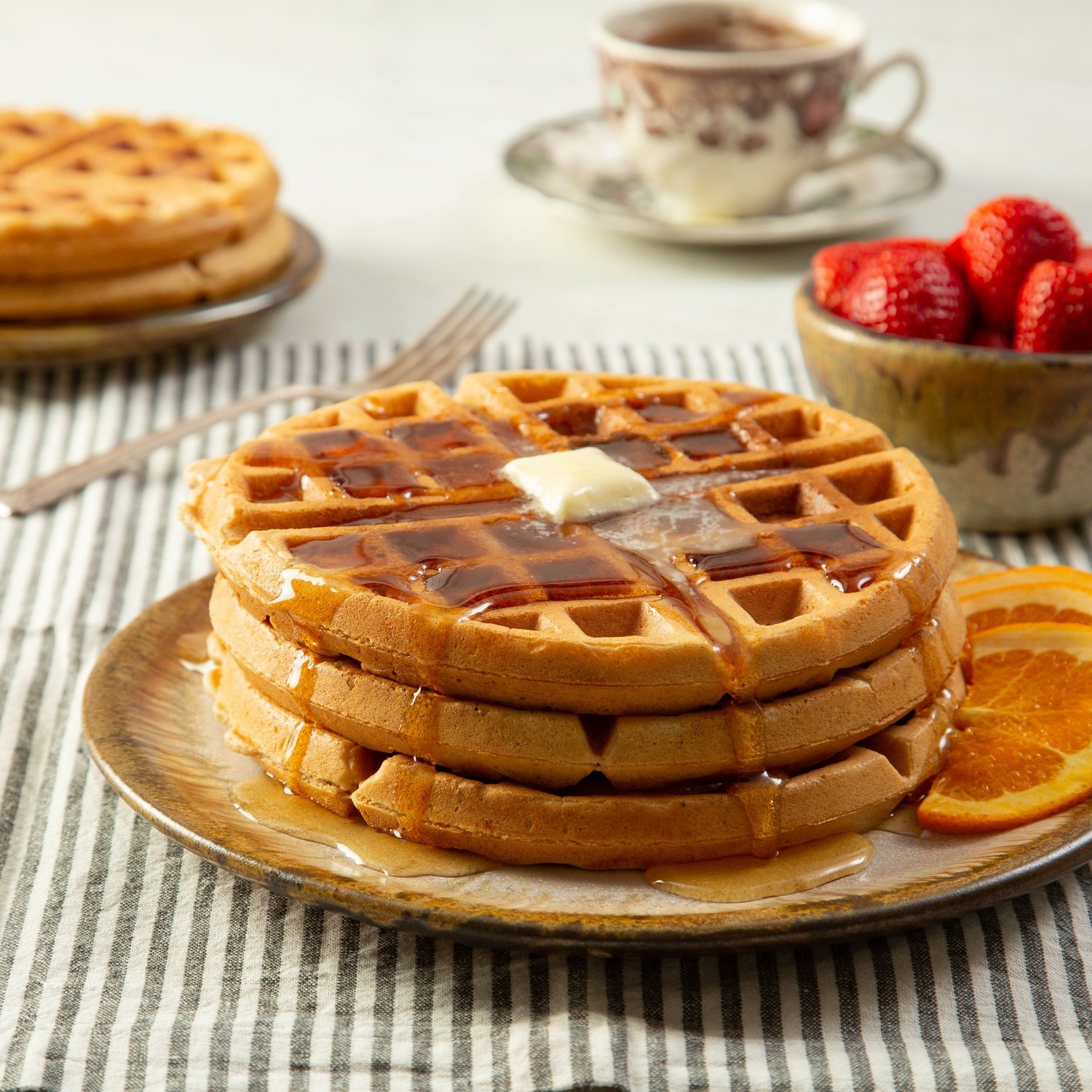 Waffle fans rejoice! These are the perfect waffles for you. We use our best-selling Old Mill Buttermilk Pancake Mix along with an extra special ingredient like our Old Mill 1830 Grind Unbleached White Cornmeal which give these waffles an unforgettable crunch. Topped off perfectly with a combination of butter, The Old Mill Cinnamon Maple Syrup and chopped candied pecans, this recipe is sure to not only hit all your senses but your taste buds too. Freeze any leftovers for a quick toast-and-go breakfast.