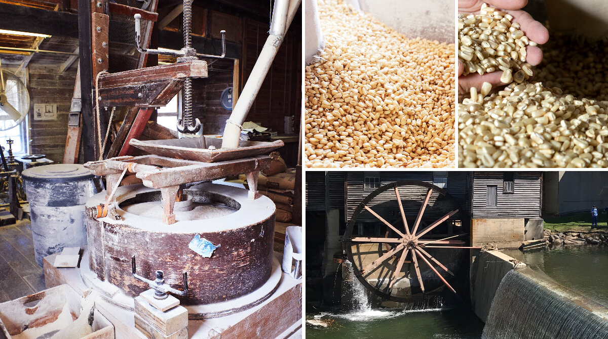 Here in our small town within sight of the Great Smoky Mountains National Park, the cycle of grains begins. Corn is ground between two massive 2,000-pound stones, only the second set of stones used in this mill since its beginning, turn by the power of our Little Pigeon River. Their peaceful motion must have seemed life-sustaining in those early days.