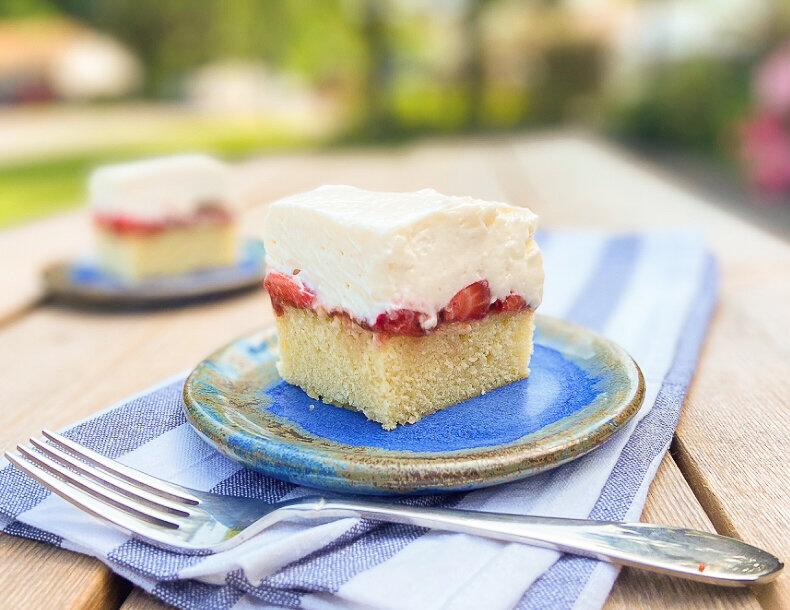 We love this cake during strawberry picking season, especially on those warm days when you want something light and refreshing.