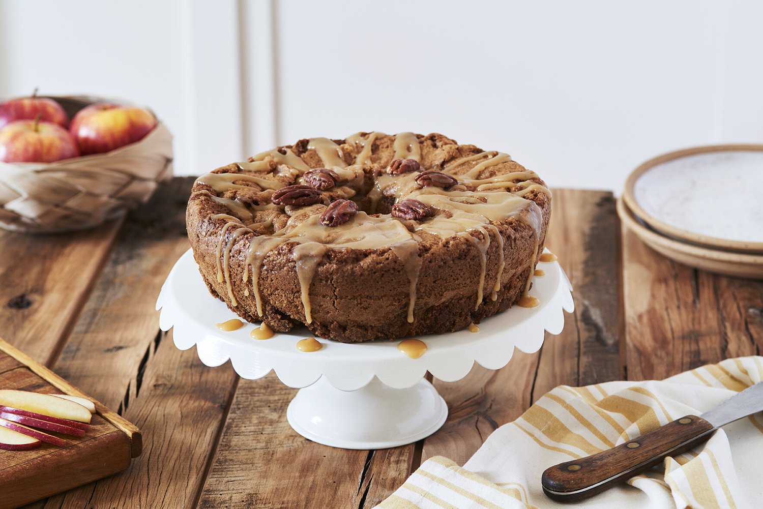 6. Run a long, sharp knife around the edges of the apple cake, and invert it onto a wire rack once and then again so that the cake is right side up. Poke a few holes in the top of the cake with a bamboo skewer, chopstick, or fork. Spoon the caramel glaze over the top of the cake while it’s warm. Let the cake cool before slicing.